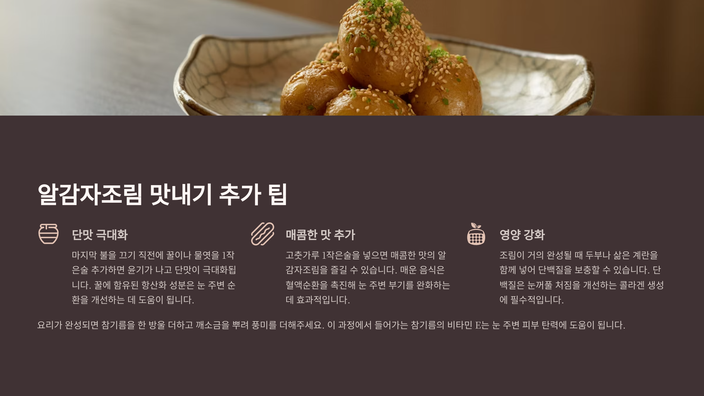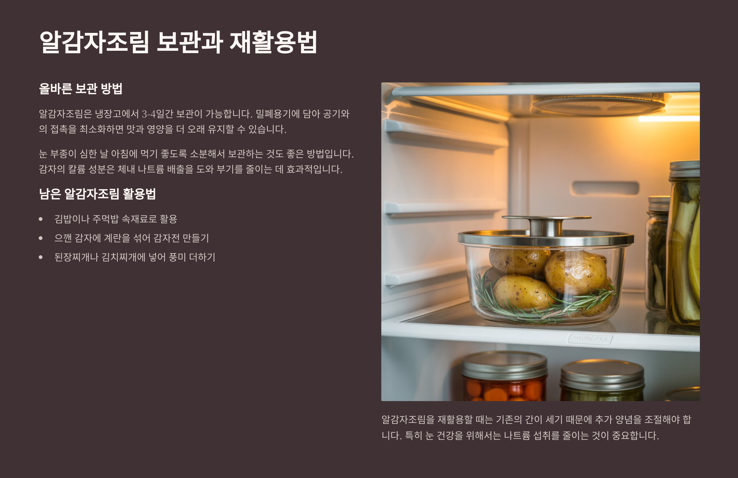 이 팁을 기억하면서 조림하면 항상 실패 없이 맛있는 알감자조림이 완성돼요. 다음에는 남은 알감자조림을 오래 보관하고 재활용하는 법 알려드릴게요!