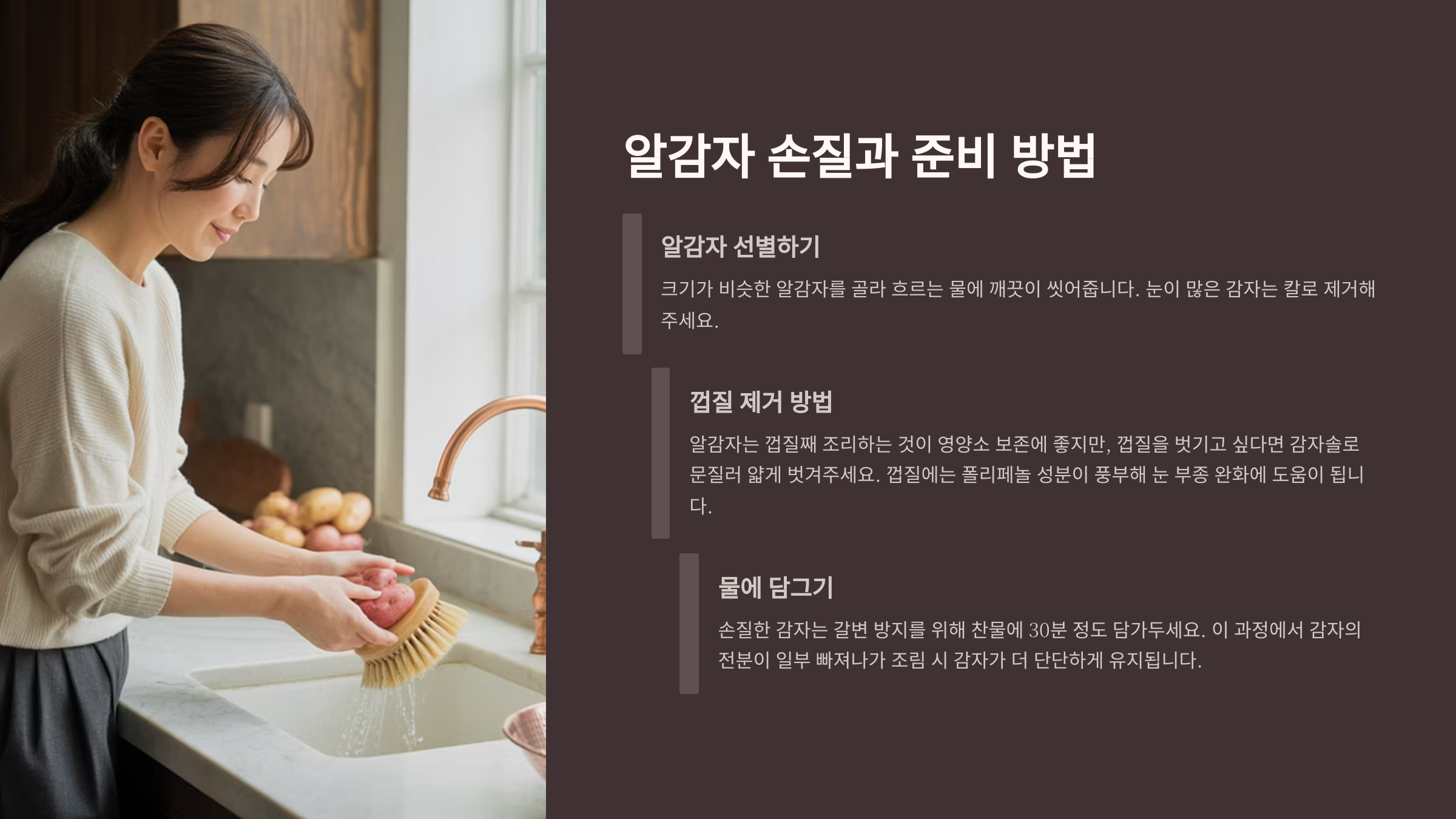 | 2. 크기 조절 | 큰 알감자는 반으로 자르기 | 익는 시간 균일 |