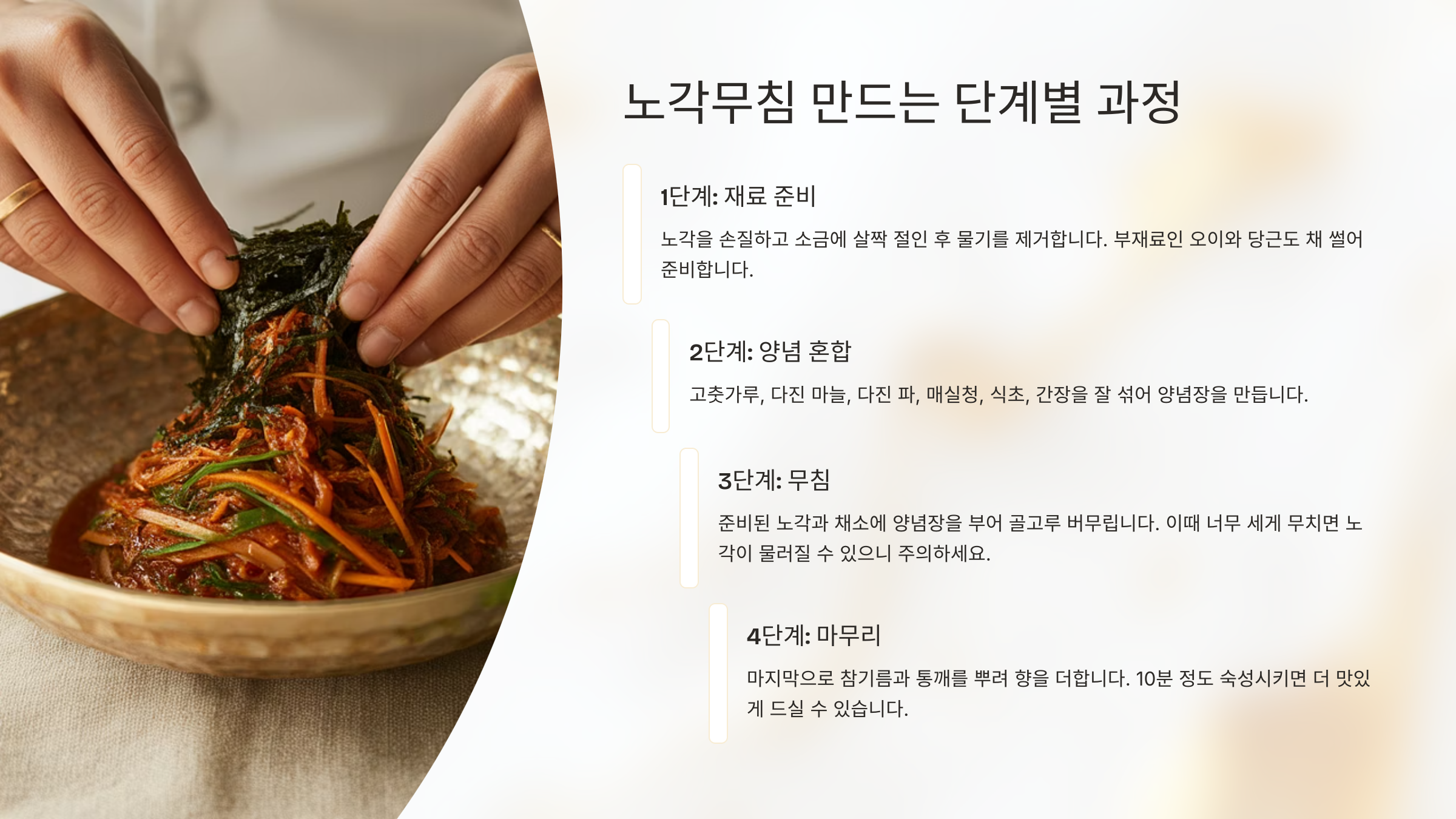 이 단계를 따라 하면 누구나 실패 없이 맛있는 노각무침을 만들 수 있어요. 손맛 더하기도 잊지 마세요! 🍽️