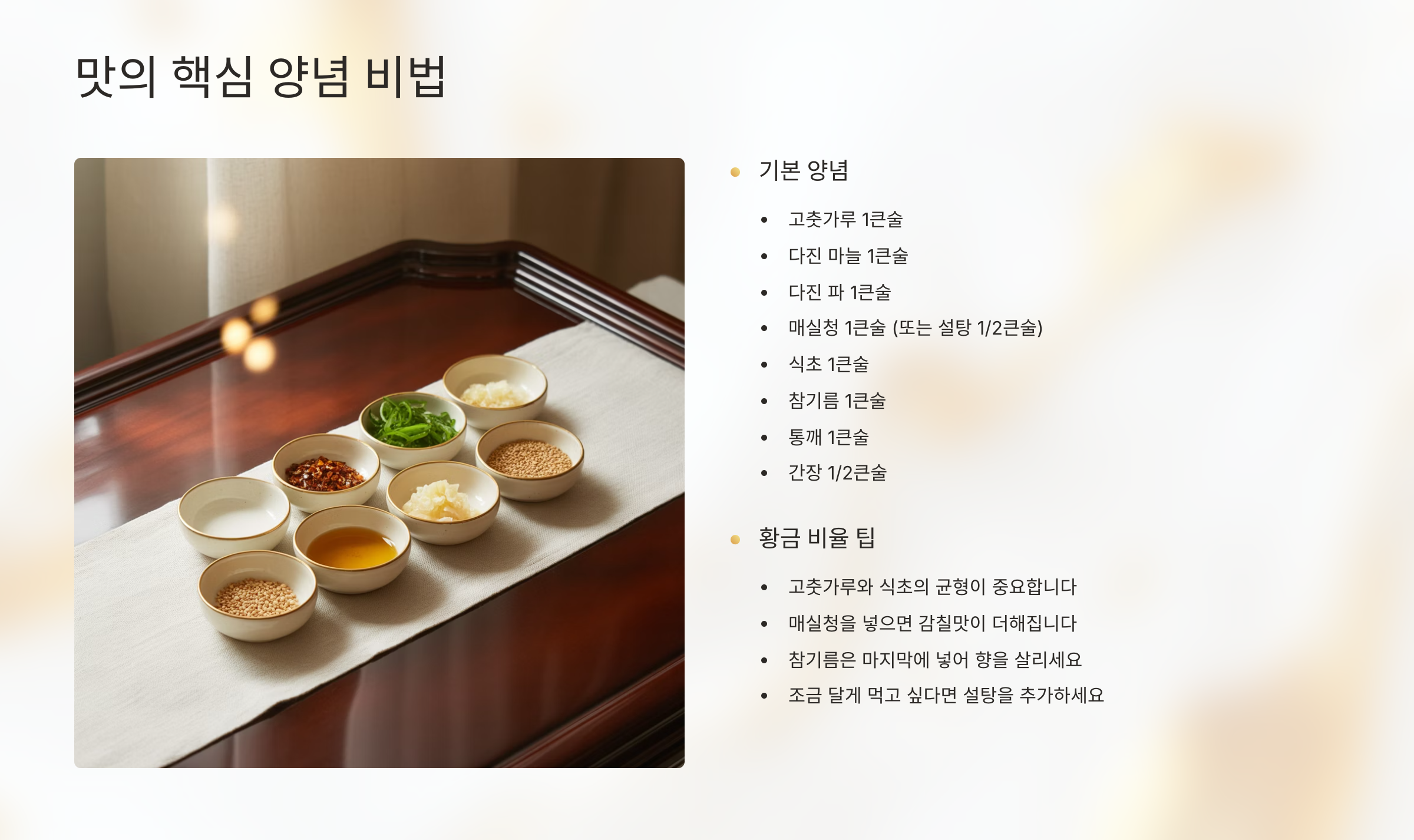 이 비율을 기본으로 하고, 취향에 따라 산미와 매운맛을 조절해 나만의 양념장을 만들어 보세요! 🌟
