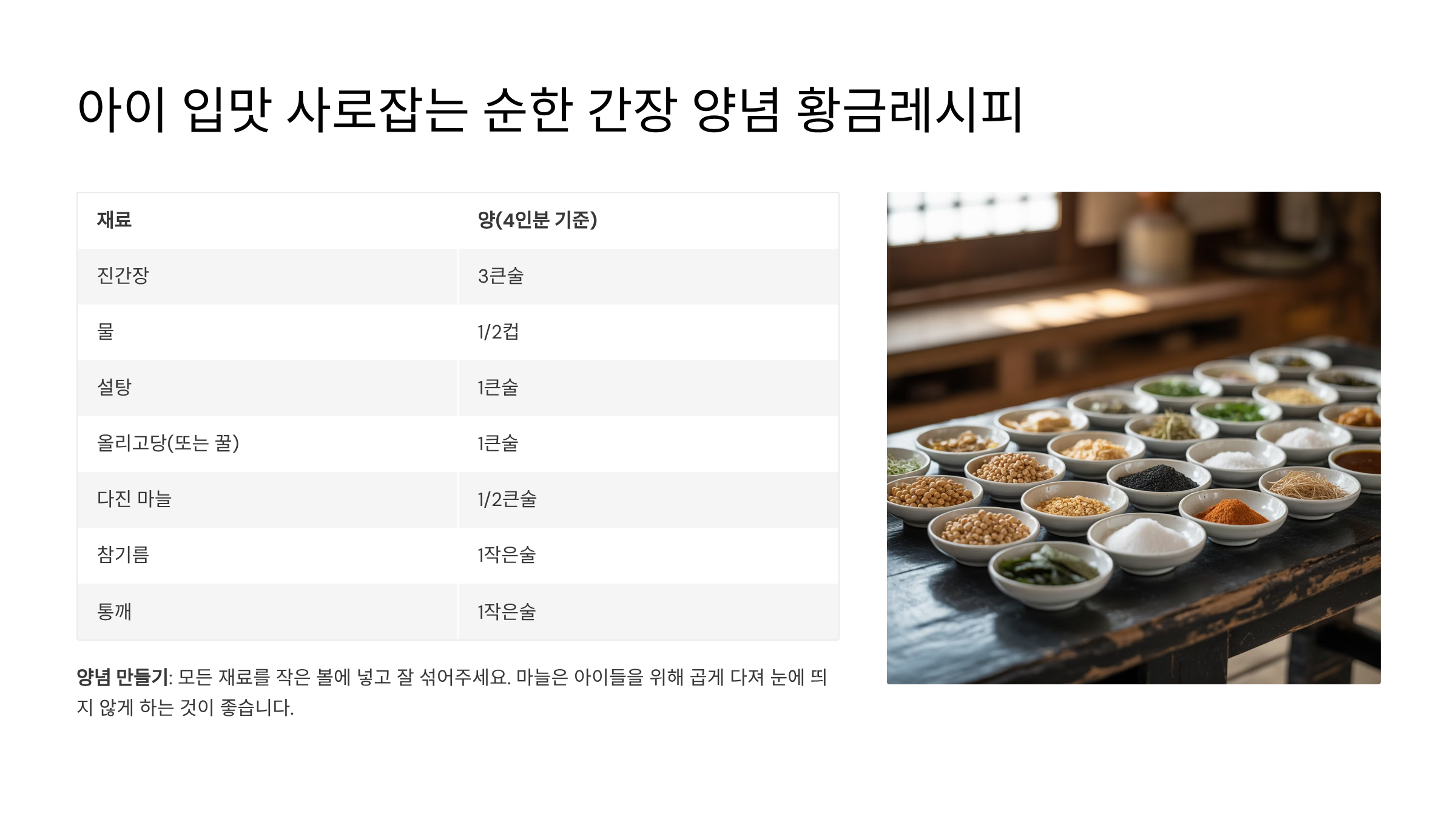 | 다진 마늘 | 0.5큰술 | 생략 가능 (아이가 아주 어리다면) |